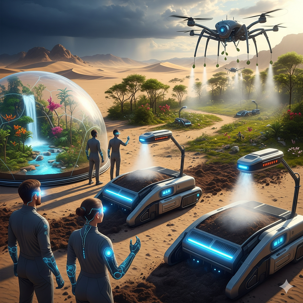How exactly we go about it, though, is a big question. Imaginative engineers may create armies of greenifying desert robots which convert sand into soil as they move across the planetary surface. They could be multi-functional and autonomous, directed by an artificial intelligence as though they were terraforming a hostile planet. Imagine such robots powered by solar light and their own movement, roving over the dunes and then to the seaside to fuel up on water with built-in desalination units. Set a few thousand of those loose and large swathes of shifting sands could be stabilized and transformed into productive soil within a single generation. I am continually amazed at the ways in which the challenges of this century such as mass environmental degradation are actually preparing us for space travel and colonization. The entire Earth is almost like a training ground for cosmic excellence, and all we need to do is start where we are. The fact stands that to solve the problems of climate change and to give our children a better world to inherit, we will need to turn the deserts into land dedicated to civilization and tree-based agriculture. The offsetting of carbon dioxide and the cooling effect of the shade upon the surface of the Earth may even be enough to change the course of the planetary destiny for the better.