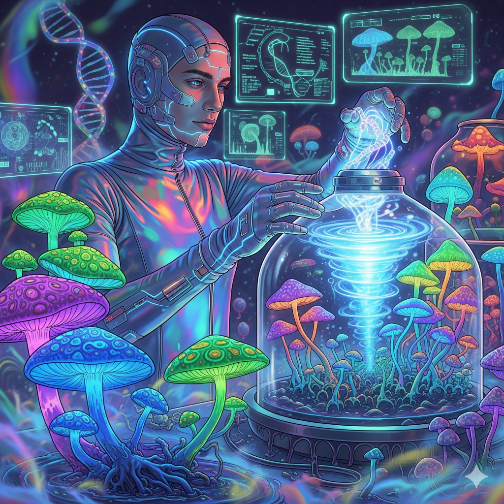 This is where certain species of mushrooms come in to save the day… except that implementation has been at a snail’s pace, as mycologists look to find optimal strains and conditions for the remediation process to take place; investors question how the huge scale of implementation required can make their capital grow. Meanwhile, the piles of refuse continue to rise. This is where biotechnology enters the picture, to fast-forward us toward futuristic solutions. Those of us with positive views of transhumanist values and ecological sensitivities may become interested in developing genetic strains of mushrooms which serve multiple purposes at once, from breaking down plastics to strengthening soil health to producing foods and medicines. Genetic engineering technologies can be seen as an opportunity not simply to make a few minute modifications for commercial viability, but to design completely new varieties which are of their own nature and which will require new Latin nomenclature to describe them.